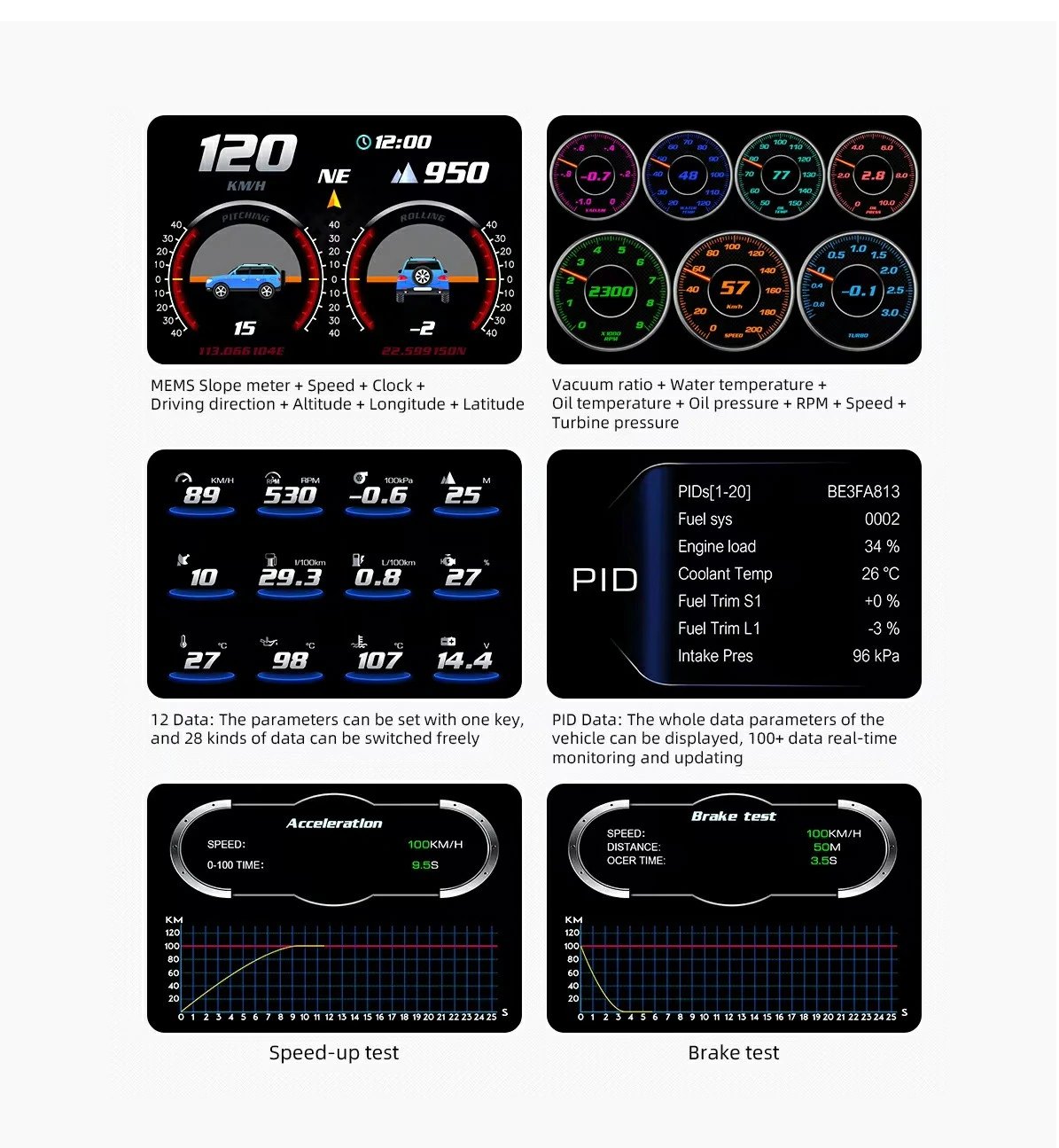 OBD2 speed,RPM,water temperature,voltage,oil temperature,transmission oil temperature,turbine pressure,instant fuel consumption,average fuel consumption,engine load,exhaust temperature,oil volume,ambient temperature,intake air temperature,power battery power,oil pressure,fuel pressure,driving direction,altitude, clock,driving distance,driving time,atmospheric pressure,gps speed,Roll angle, pitch angle,PID datasDTCs Starus, Freeze DTCs, Loop Status, Engine Load,Coolant Temp,Fuel Trim,Fuel Rail Press, Intake Pressure, Tacho, Speed, Ignition, Intake AirTemp, MAF Rate, Throttle Pos, Oxygen Sensor, OBD Type, Aux Input Status, Engine Run time, Mil distance, FRP Ref Manifo, Fuel Level, Warm-ups Count, Distance, Barometric Pre, Air Temperature, Battery Voltage, ODO Distance, Trip Distance, Trip Drive Time, Average Speed, LPH, LHK)) |
