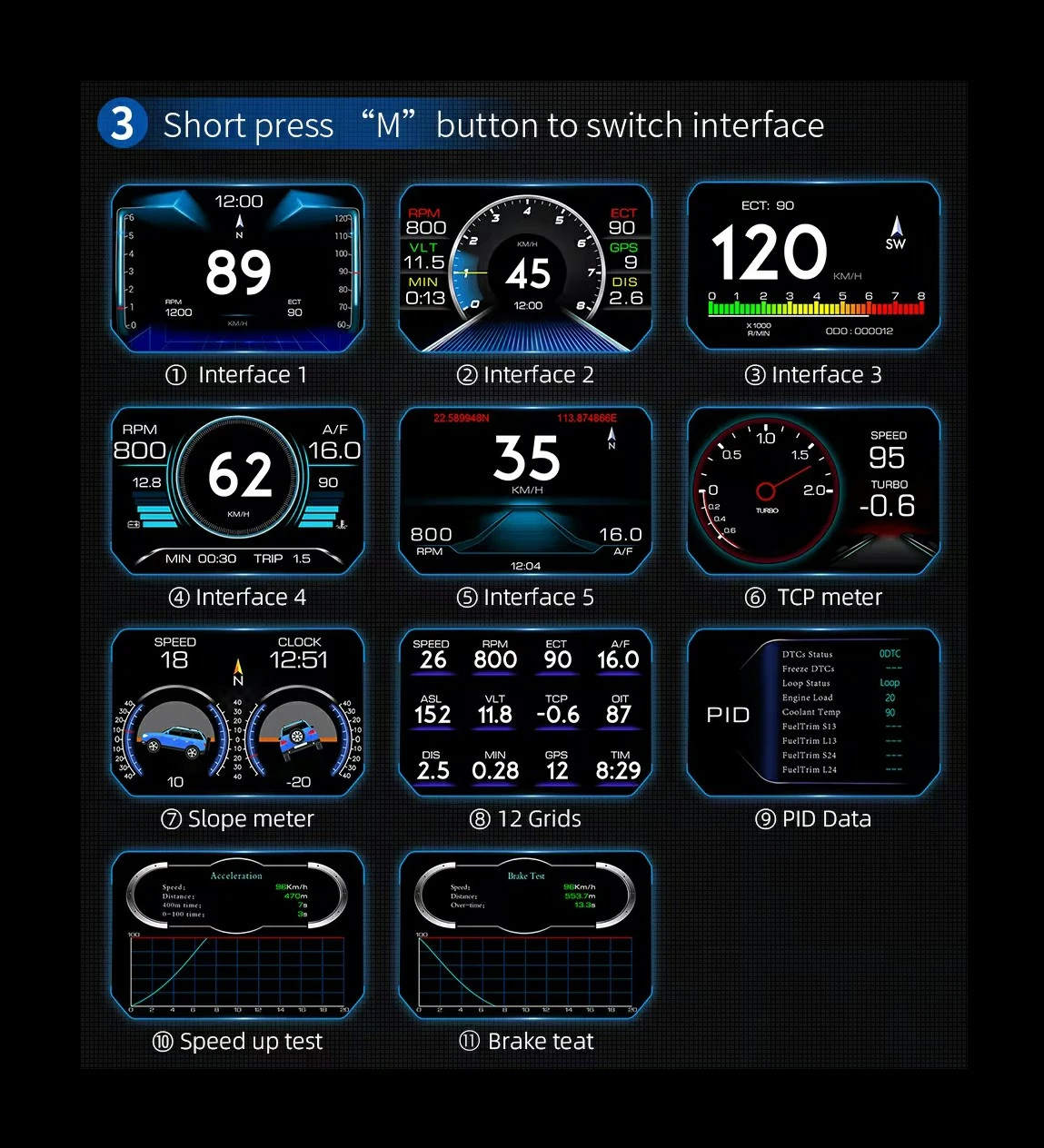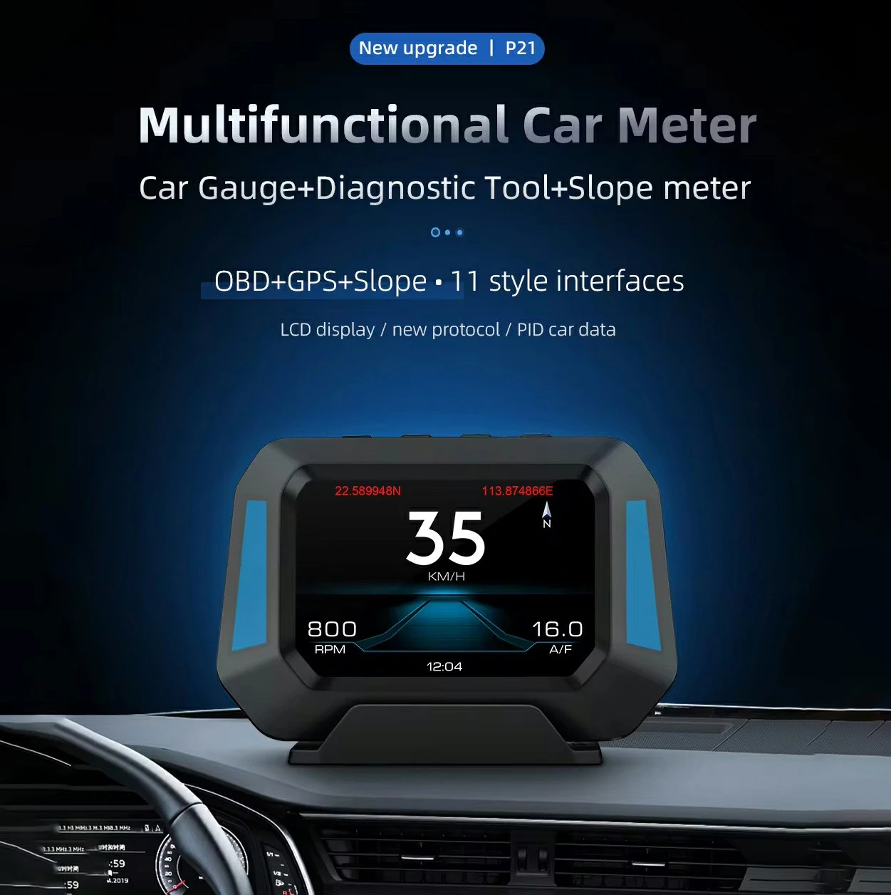 0P21 HUD UP DISPLAY,OBD2/GPS FOR TOYOTA OBHUD OBHUD-0P21 (SKU 30-125) Resolution : 480 x 240 Function : Clock, Voltage Alarm, Fatigue Driving Alarm, Driving Time, Engine RPM, Driving Distance, vehicle speed(Km/h or MPH), water temperature(°C or °F), Over speed alarm, Water temperature alarm,, error code Alarm, clear error code, fuel consumption, ODO meter, Kilometers per liter, oil temperature, turbine pressure, air fuel ratio, intake pressure, gps satellite numbers, altitude, speed up test, brake test, 48 professional date stream, pitch angle, roll angle |